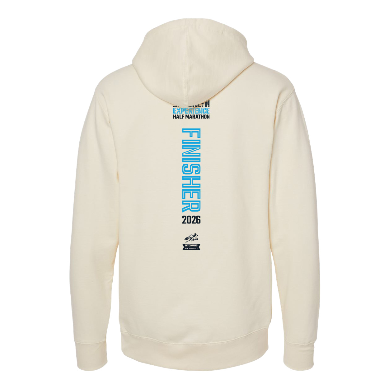 Brooklyn Experience Half Marathon 2026 Finisher design. Classic pullover sweatshirt hoodie featuring 8.5 oz/sq.yd. (288 gsm) fleece with a jersey lined hood, heavy gauge drawcord and metal eyelets, and ribbed waistband and cuffs. Standard fit. Item ID bmpff13864n