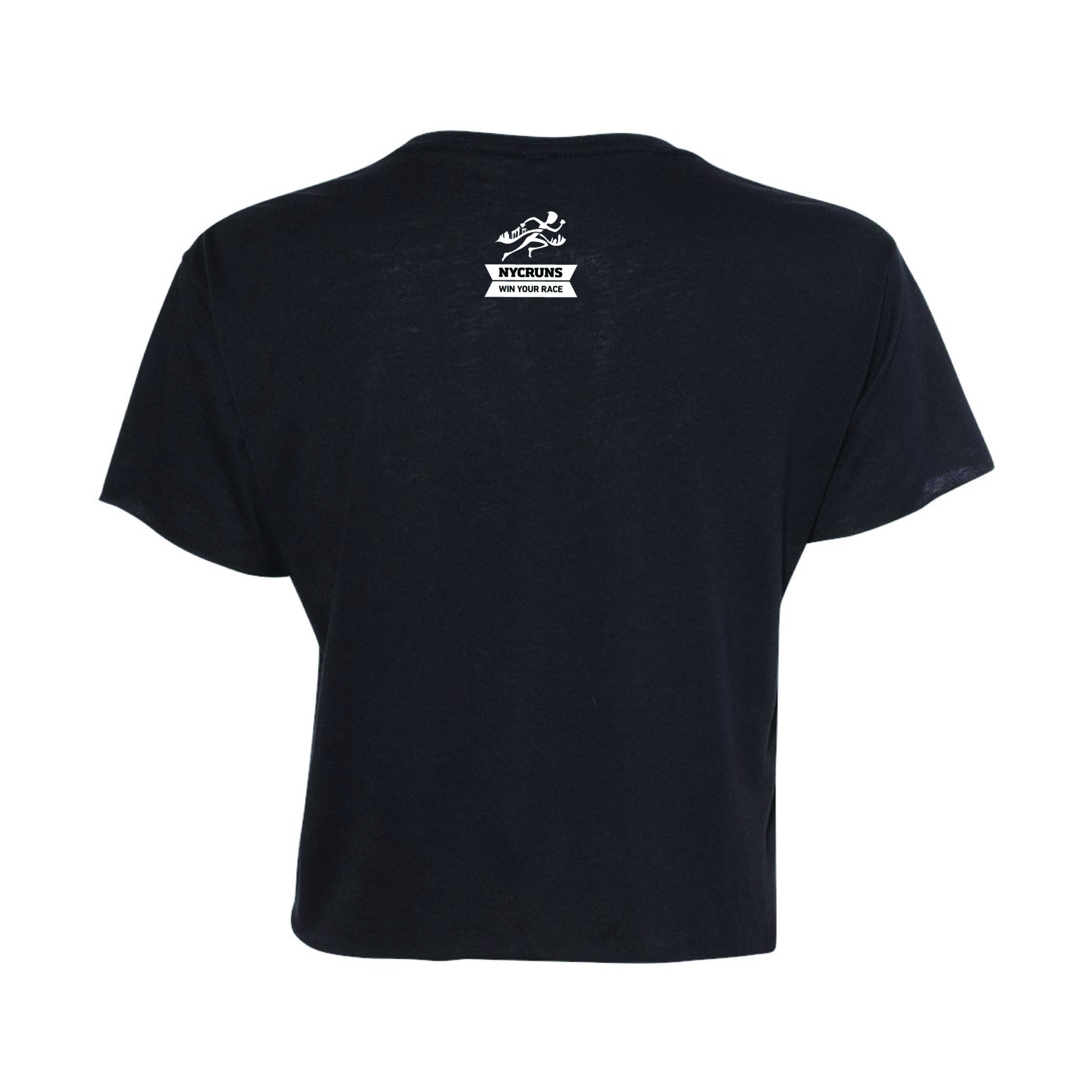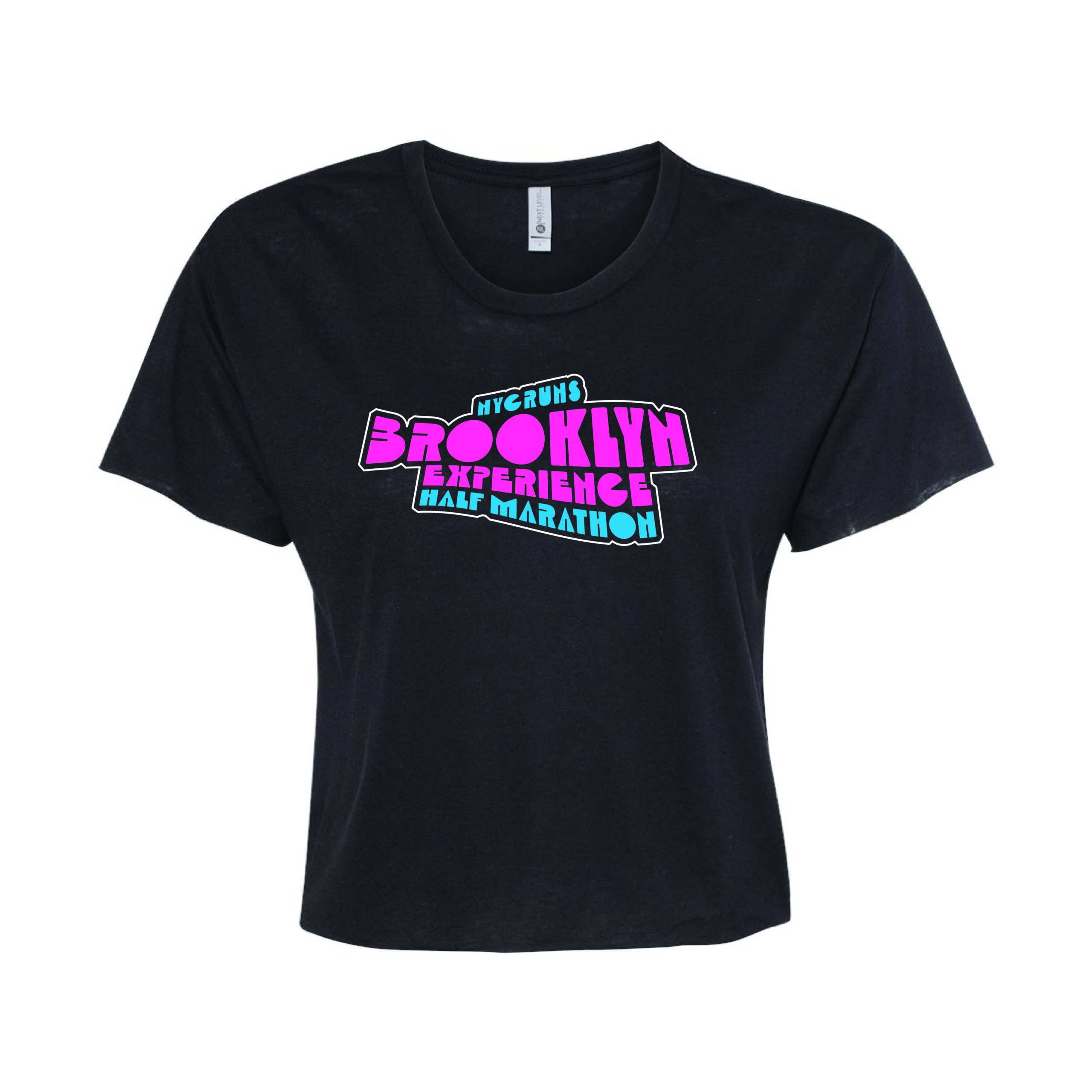 Brooklyn Experience Half Marathon Warped design. Coastal vibe in a modest crop short sleeve t-shirt, with a raw hem. 3.5 oz/sq.yd. (120 gsm) 65/35 poly/combed ringspun cotton fabrication. Side seamed, relaxed fit. Item ID bmpd761113w